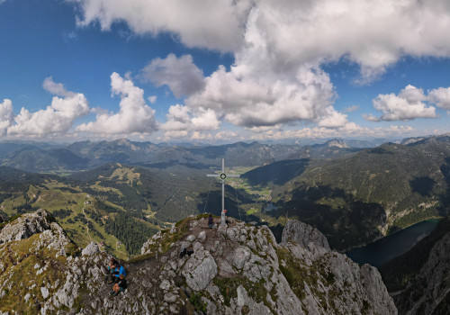 Der Steig führt uns hinauf auf den Großen Donnerkogel mit 2054 Metern Seehöhe. Oben wartet ein Panorama über den Gosaukamm und das Dachsteinmassiv.
